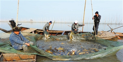 昨日,嘉鱼县渡普镇养殖大户陈川荣2800亩拦网正在起捕草鱼、鲤鱼,销往武汉。
