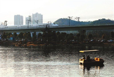 5日,在十六潭公园内,游人乘坐小游艇在冬日暖阳下感受湖光山色,一辆城际铁路动车从旁穿过。近年来,我市先后开展10多项市容市貌和环境卫生整治,不断完善城市基础设施建设,城市人居环境不断改善,城市品位不断提升,香城泉都变得更美更靓了。记者 大乐 通讯员 杨火生摄