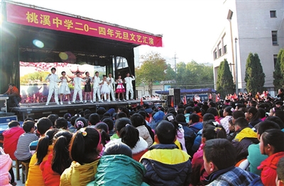 2013年12月31日下午,崇阳县桃溪中学广场内歌舞飞扬,喜庆气氛浓烈。桃溪中学2014元旦文艺汇演正在火爆进行,有歌曲、舞蹈、相声、小品、器乐、校园剧等26个剧目,学生演员相继登场,节目精彩纷呈,掌声、欢笑声不绝于耳,冬日的校园顷刻间充满了生机和活力,全校师生和部分家长欢聚一堂,共度元旦美好时光。特约记者 汪淑琴 汪国文摄