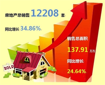 日前,市房产局的一组数据显示:去年全年,我市房地产总销售12208套,同比增长34.86%;销售总面积达137.91万m2米,同比增长24.64%。