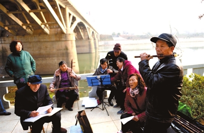 12日,崇阳县老干部乐队在隽水河畔演奏民族歌曲,吸引众多市民驻足欣赏。在崇阳县,由退休老人自发组成的乐队还有很多,每逢节假日,公园、社区、广场处处能看到他们活动的身影。当地群众说,老干部乐队快乐了自己,又丰富了市民文化生活。
