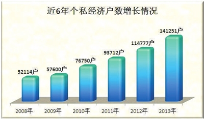 近几年,个私经济保持快速发展的势头,2008年至2013年,全市个私经济户数分别为52114户、57600户、76750户、93712户、114777户、141251户,环比增长率分别为10.53%、33.25%、22.10%、22.48%、23.07%。