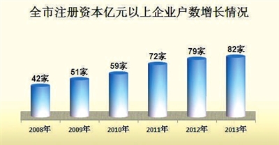数据显示:近六年企业规模实力持续扩张,注册资本过亿元以上的企业稳步增长。2007年38家,2008年42家,2009年51家,2010年59家,2011年72家,2012年79家,2013年 82家;2007年,注册资本2亿元以上的企业全市有8家,5亿元以上的有4家;到2013年末,注册资本2亿元以上的企业已增长到5家,5亿元以上企业已增长到7家。