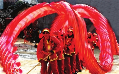 日前,通山县横石村龙灯队走村串户进行舞龙表演。这支由13人撑起的龙灯队,在节日里盛装打扮、坚持为村民们送去欢乐和新年祝福。 通讯员 陈新权 敖琼 摄