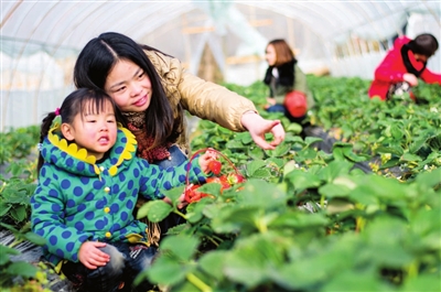 日前,游客正在通山县湄港草莓园采摘牛奶草莓,体验采摘之乐,感受果实香甜。 该基地位于通山城郊,由于交通便利,春节期间吸引了成百上千的游客前往 采摘。 通讯员 陈茂林敖琼摄