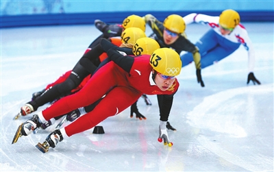 北京时间2月16日,在2014年索契冬奥会短道速滑女子1500米决赛中,中国选手周洋以2分19秒140的成绩夺得冠军,成为冬奥会卫冕该项目第一人。图为周洋在比赛中。据新华社