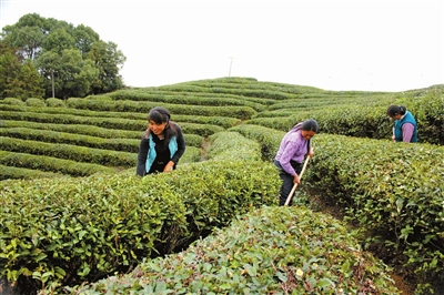 昨日,通城县沙堆精制茶厂员工在为茶树松土施肥。 元宵节刚过,该县农民便掀起了春耕备耕热潮,纷纷走进田间地头,加强春季农作物培育管理。 特约记者 刘健平摄