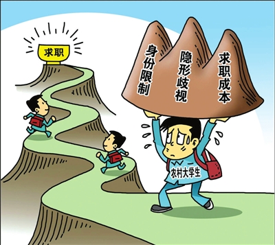 中国社科院发布的《社会蓝皮书:2014年中国社会形势分析与预测》指出,我国农村家庭普通本科毕业生失业率高达30.5%,身份限制、隐形歧视以及求职成本高是农村大学生求职普遍面临的“三大难”。 (朱慧卿 作)