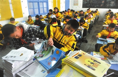 昨日,开学第一天,市实验小学四(七)班教室内,学生们正在分发新书。据悉,新的学期,该校将更加注重素质教育,让学生在快乐中学习和成长。 记者程慧摄