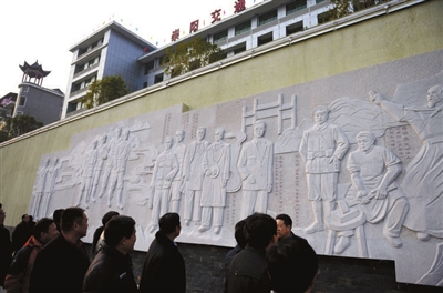 13日,游客在崇阳县天城公园参观历史文化长廊。该长廊雕刻有该县名史、名人、名俗、名言等,从多个角度展示了崇阳悠久灿烂的历史文化,独特的民俗风情,具有极高的历史文化价值和艺术欣赏价值。记者 袁灿 摄