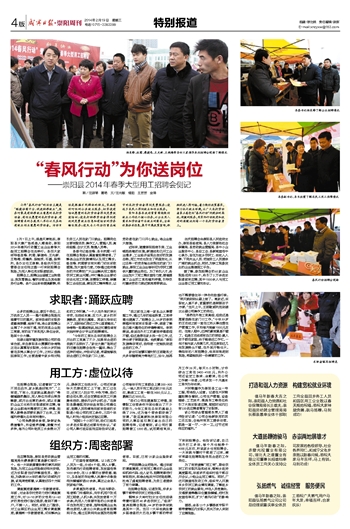 在应聘现场,崇阳县劳动就业管理局局长蔡崇景可算是最忙碌的一个。他一大早就冒着刺骨的寒风来到现场,为用工企业进场做好相关安排,还为求职者当好讲解宣传员。据介绍,为确保2014年的春风行动顺利开展,该局周密部署,认真做好四个方面的工作。