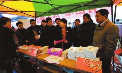 在招聘会现场,记者发现,许多乡镇干部带领农民工进场求职。