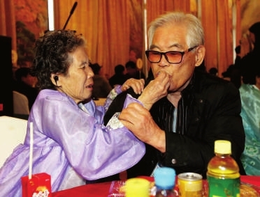 2月21日,在朝鲜金刚山宾馆,身在朝鲜的妹妹金奉玉为来自韩国的哥哥金奉学喂樱桃吃。当日,在朝鲜金刚山宾馆举行的韩朝离散家属团聚活动进入第二天,韩朝的离散家属们共进午餐,聊叙相隔半个世纪的相思之情。据新华社