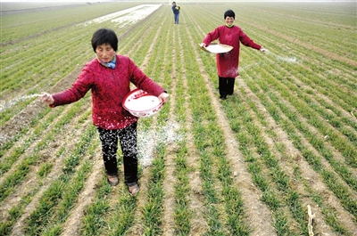 2月23日,山东省茌平县贾寨镇的农民在给小麦浇水、施肥。