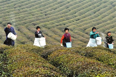 2月27日,嘉鱼县官桥镇红旗茶场内,茶农们正利用阴雨天给茶树追肥。当前,正值春茶管理关键时节,茶农们担着肥料上茶山、进茶园,对茶树进行锄草、松土、修剪、施肥,掀起了茶园春季管理热潮。