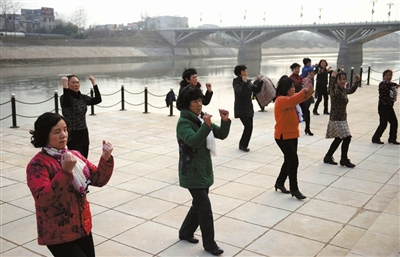 1日,崇阳县市民在隽水景观带练健身操。近年来,该县重视城市公共文化设施建设,先后建起大集广场、隽水景观带、天成公园等,为广大群众开展各种文体娱乐活动提供了良好平台。 记者 袁灿 摄