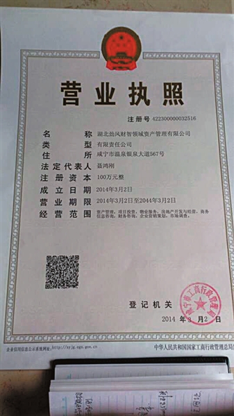随后记者用手机扫描“湖北劲风财智领域资产管理有限公司”营业执照上的二维码,很快手机屏幕上就显示出湖北省市场主体信用信息公示系统的该公司页面。“市场主体基本信息”包括企业名称、注册号、市场主体类型、法人、住所、经营范围、注册资本(金)等;“投资人及出资信息”明确显示出各个投资股东的认缴出资额。