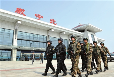 5日,我市特警、武警部队在咸宁北站站前广场巡逻。