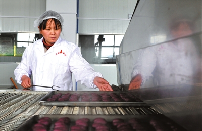10日,湖北心甜心食品有限公司生产车间内,摆放整齐的小紫薯,正冒着热气,从蒸道内缓缓“驶”出。该企业位于通城县石南镇花亭村,总投资1500万元,现有5000亩原材料生产基地和现代化的薯类食品加工厂。据了解,该公司年加工红薯250余万公斤,产值3000万元,带动周边140名农民就业。