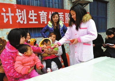 14日,崇阳县白霓镇计生工作人员正在给当地育龄妇女发放计生宣传手册。据了解,为抓好今年的计生工作,该镇开展“计划生育优质服务下乡”行动,对辖区22个村和1个社区的5000多名育龄妇女免费上门查环查孕,截至3月上旬,已免费筛查3000余人。