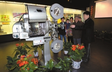 3月20日,在河北邯郸博物馆,农民收藏家魏少先(右一)向参观者介绍“松花江5502X-35毫米固定式放映机”。