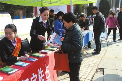 日前,赤壁工行设立户外宣传服务台,宣讲防欺诈、防假币、识假币、反假币等金融知识,旨在引导消费者依法、理性维权,建设群众满意银行。图为该行工作人员向市民发放金融知识宣传画册。