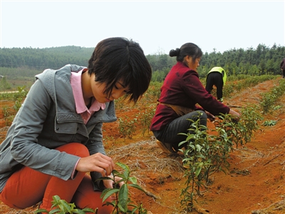 3月21日,咸宁市汪大珍茶业发展有限公司双溪镇茶叶基地里,农户正在采摘初茶。由于科学种植、科学管理,该公司去年冬月栽的茶苗短短5个月时间已开始收益,主要品种有碧香早、浙农117等,每亩年产值达万余元。