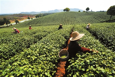 3月27日,咸安区横沟春华有机茶基地,村民正在忙着采摘头茶。该茶园种植的有机茶面积达到380亩,茶叶品相好,销量也好。