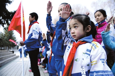 4月1日,西宁市玉井巷小学学生向中国工农红军西路军纪念碑行礼。