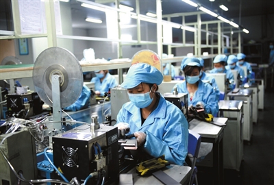 6日,湖北(嘉鱼)中能锂电科技有限公司生产车间内,工人正在赶制外销产品。该公司是集研究、开发及生产锂离子电池为主的高科技企业。目前,一期已建成投产,预计实现年产值6亿元。 记者 袁灿 摄