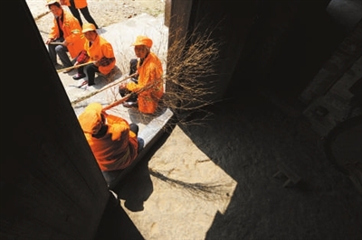 脚还没站稳,就听见“刷刷刷”的扫地声已响起。由于这里运输车多,灰尘很大,没扫多大一会,几个人就被淹没在“灰海”中。