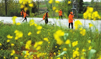 嘉鱼县至高铁岭镇的公路上有这样一道风景线:每天清晨,在薄薄的晨雾中,5名身着橘黄色衣服的保洁员,像一个个音符在飞扬的尘土中跳动。她们,负责高铁岭镇五公里窗口路段的保洁,披星戴月、风雨无阻——