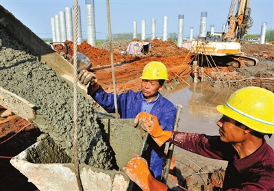 9日,嘉鱼县新街镇嘉鱼长江大桥引桥段,工人们正在浇筑桥墩桩基。