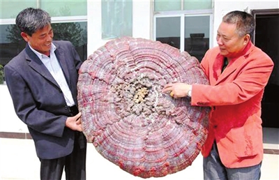 近日,谷城县茨河镇一饮品公司惊现一朵巨型野生灵芝,足足有半人多高。经测量,灵芝直径1.1米,重达2.5公斤。公司总经理李奎称,曾有一个浙江老板出资10万元欲购买,他没舍得卖。