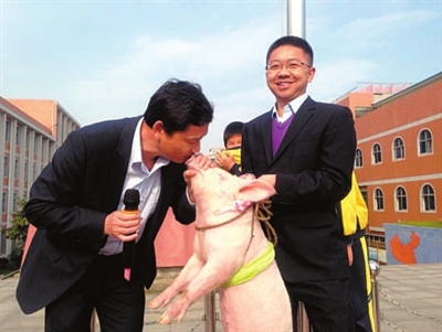 跟这头小猪站在一起的,是分管学生德育工作的副校长洪耀明。