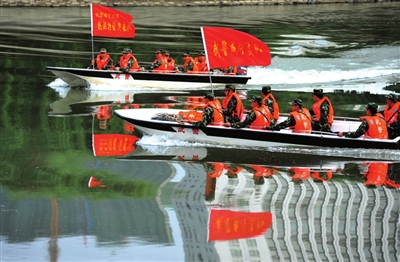 15日,武警咸宁市支队武警官兵在淦河水域进行冲锋舟操作手培训。