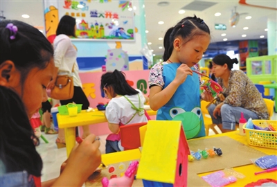 6月1日,温泉某商场儿童区,小朋友们正在动手制作玩具。据了解,今年端午节小长假恰逢“六一”儿童节,许多家长带着孩子们出门过节,不少商家抓住商机,推出布艺、陶艺、纸质等手工DIY,吸引了许多小朋友现场体验。手工DIY让孩子们在玩中学习,既锻炼孩子们的动手能力,又开发了孩子们的智力。 记者 夏正锋摄