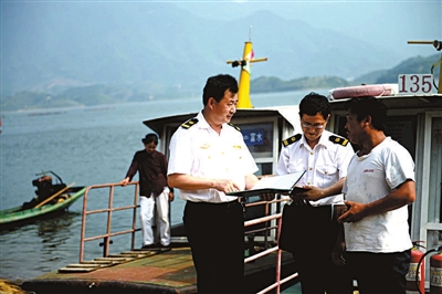 21日,通山县海事处在慈口乡检查船舶营运情况。从2012年开始,该县海事部门筹资1100多万元,将大畈、燕厦、慈口等库区乡镇的157艘破旧船舶全部更新为铁壳客船,并配备GPS卫星跟踪系统,保障库区群众平安出行。记者 袁灿 特约记者 程平利 摄
