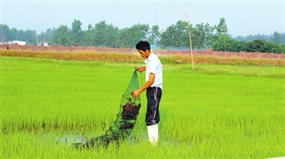 6月22日清晨,在一片小米草中,王世洪正在起地笼收龙虾。据悉,2013年,王世洪承包并改建鱼岳镇陆码头村三组的300亩稻田,开展鳖虾鱼稻生态养殖,4月至今已销售龙虾万余斤。通讯员 雷平摄