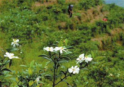 20日,崇阳县路口镇田铺村药材基地,千亩栀子花芳香四溢。据田铺村干部介绍,该基地是回乡创业青年苏成于3年前投资兴建,开发荒山1000余亩,现已累计投资270万元。今年到了受益期,预计亩产150公斤、效益5000元。