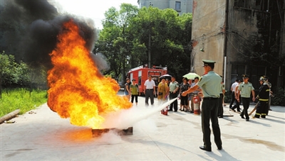 19日,嘉鱼县消防大队来到鱼岳镇北街社区,举办消防知识培训班,现场进行消防演练。
