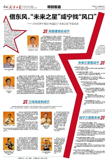 2014(第十四届)中国企业“未来之星”年会在咸宁举行。主办方认为,随着城镇化的推进,三线城市越来越受企业关注,咸宁拥有优美的生态环境、良好的区位条件,是中国最具成长力创新型城市,“香城泉都”正在走上绿色崛起之路。从一定意义上说,以咸宁为代表的三线城市,谋求绿色发展,也是一个重要的商业趋势。在主题演讲和高峰论坛中,商界领袖、专家学者和政要们纷纷对咸宁发展寄予厚望。