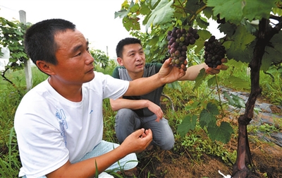 7日,嘉鱼县鱼岳镇金色田园有机葡萄示范基地,技术员龙华明正和管理员查看葡萄长势,再过大约1个星期,20多亩夏黑葡萄就可以上市了。据介绍,今年基地新栽葡萄苗280余亩,预计明年可挂果,全部挂果后,产值将突破600万元。果园采用有机种植模式,市场前景看好。记者 夏正锋 通讯员 陈锦秀摄