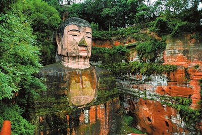 从九曲栈道的石阶环山而下,到达大佛的脚下,这时方才看清大佛的全貌。大佛依山凿成,正襟危坐,俯瞰大渡河、岷江、青衣江三江汇流处。仪态端庄肃穆,面容清秀安祥,慈祥凝重,形态逼真,惟妙惟肖,犹如天造地设,令人叫绝。临江远观,但见大佛眉梢处微微一笑,从容而宁静地望着天上风卷云舒。