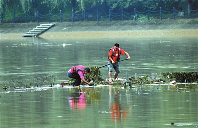 (图1)19日,淦河丹桂桥段,管理人员正在清理依附在音乐喷泉上的杂草。受18日下午大风暴雨天气影响,上游漂浮过来的杂草枯枝依附在了音乐喷泉上。为保障音乐喷泉正常运行,管理人员及时进行了清理。 记者 夏正锋摄