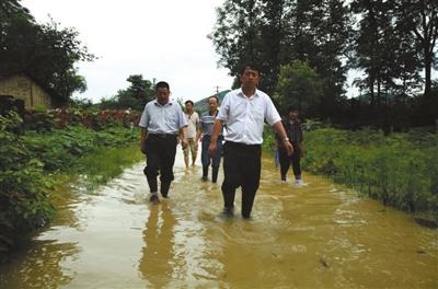 进入谭家村口,道路被淹,车辆受阻,无法前行。看到道路两旁大面积良田被淹,不少村民正忙着从浸水的房屋里转移家具,河堤险情控制得如何?杨良锋非常焦虑。打开车门,一脚踏进齐膝深的洪水中,坚定地向着河堤决口的方向疾行。