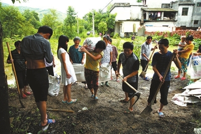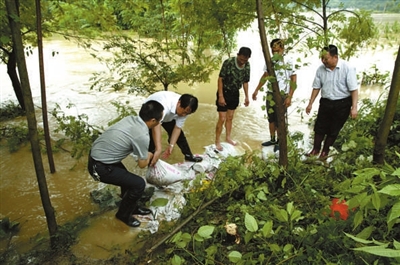 闻讯,不少县领导赶来了,镇村干部来了,连村里的一些老人和妇女也来了,他们铲的铲、装的装、运的运,一下子组成了一支30多人的抢险队伍,与不断上涨的洪水抢时间,争速度,堵塞决口。