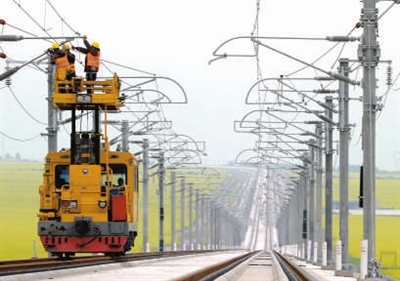 20日,在青海省门源县境内的兰新铁路客运专线工地,工人在架线施工。被誉为“钢铁丝绸之路”的兰新铁路客运专线,全长1776公里,今年底全线通车后,将是目前世界上一次性建设里程最长的高铁,也是我国首条在高海拔地区修建的高铁。 据新华社