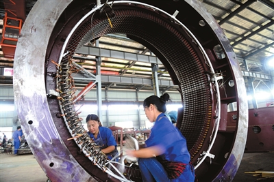 16日,湖北二电电气有限公司员工在安装水轮发电机组。