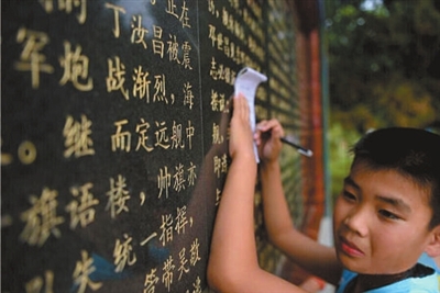 ③ 一名小朋友在抄写邓世昌墓碑记。